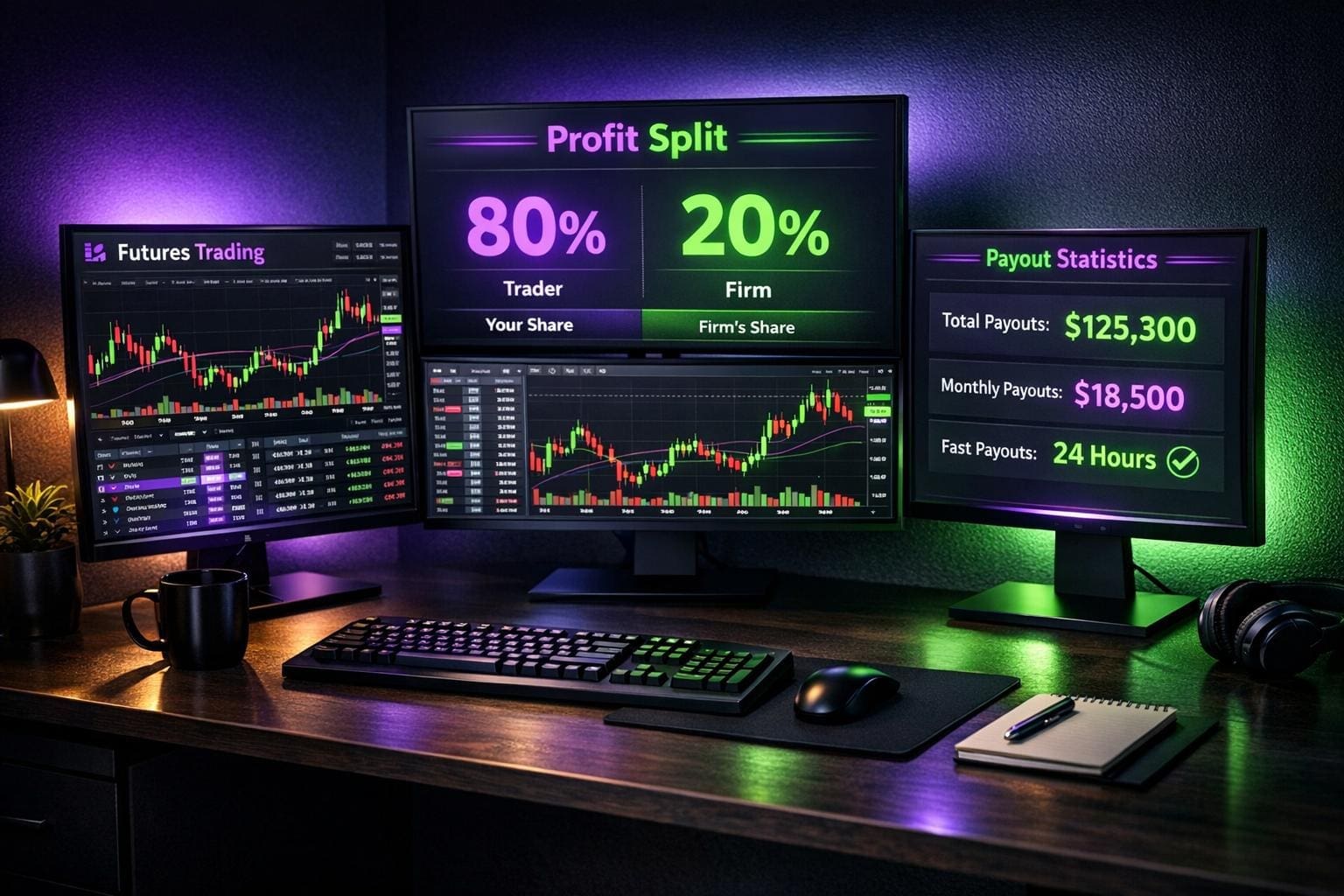 Most futures prop firms split profits 80–100% for traders, but payout timing, drawdown rules and evaluation difficulty determine real take-home pay.