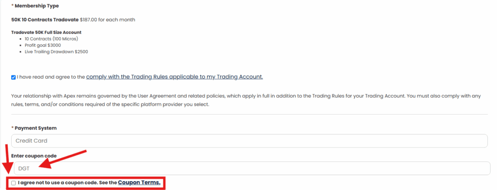 - On the account page, enter the coupon code DGT. Do NOT press the “I agree not to use a coupon code” box.