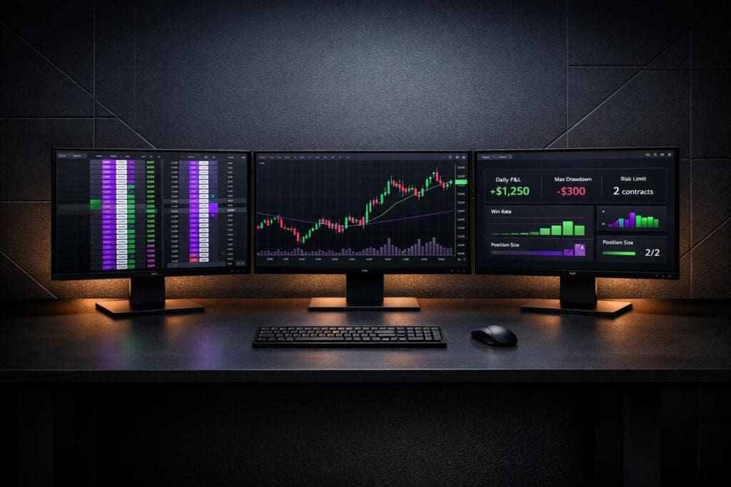 Many traders begin evaluations using MES contracts to preserve their drawdown buffer. Once they’ve built a profit cushion, they transition to full ES contracts for higher returns.